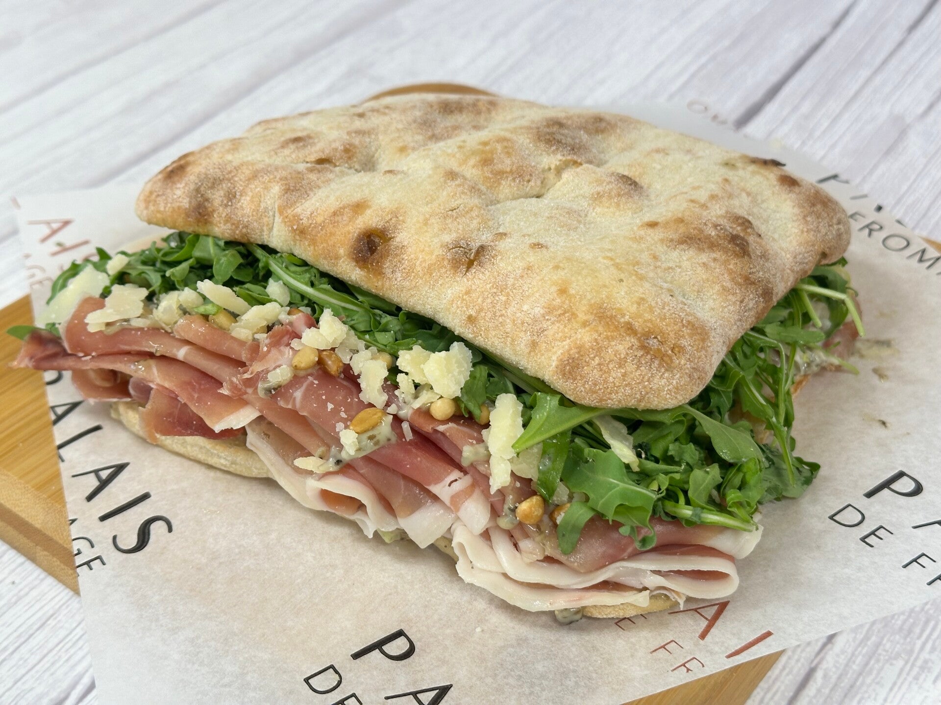 Mortadella pistachio (Italiaanse ham), Grano Padano, pickled red onion, truffelmayonaise, rucola