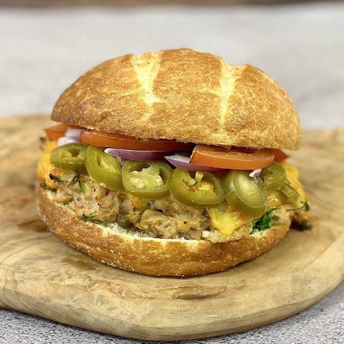 Tonijnsalade, Cheddar, ui, jalapeños, tomaat