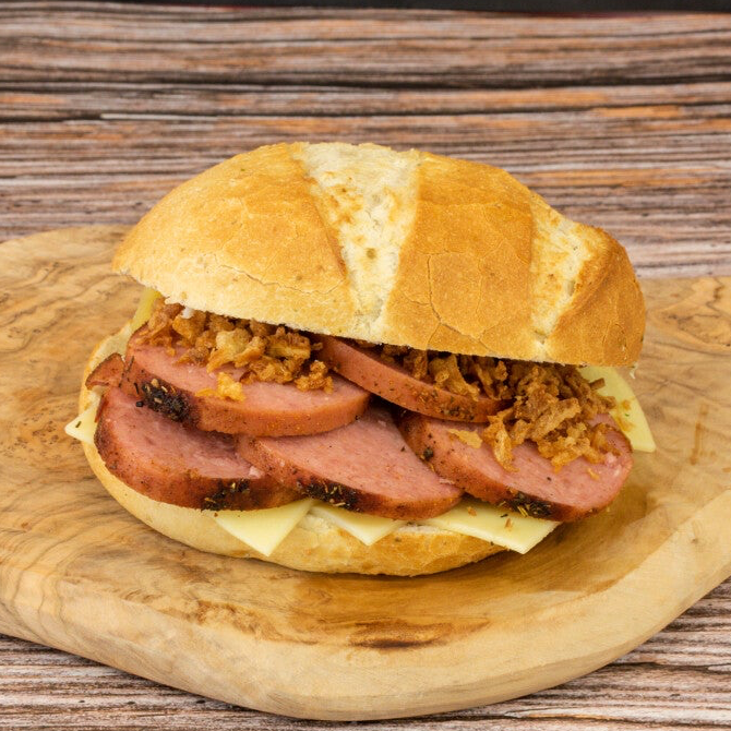 Grillworst (keuze uit halal kip of varken), kaas, gebakken ui